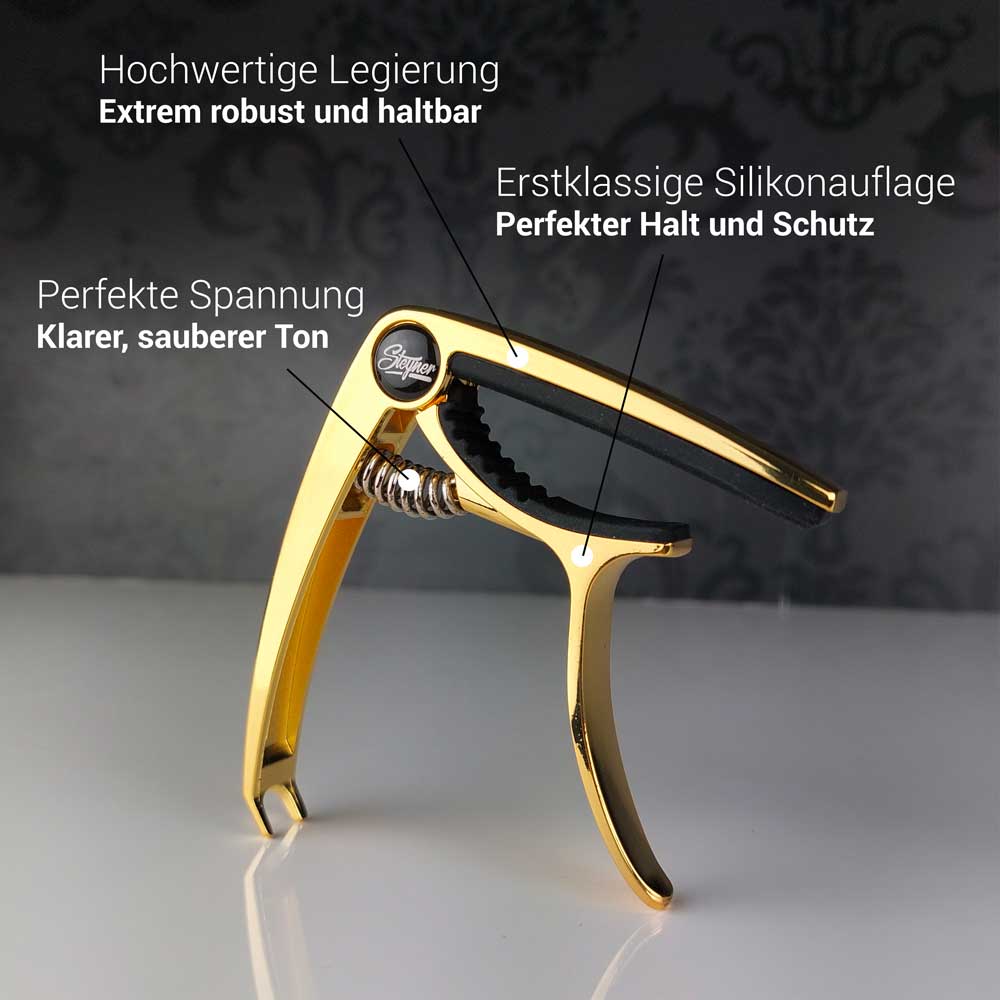 Put an end to annoying buzzing and incorrect intonation while playing guitar. The Steyner Capo ensures clean tones with just one hand movement and looks incredibly elegant while doing so. Most capos quickly become loose, make the strings sound untidy, and are not visually appealing. Our Steyner Premium Capo combines all of these features.